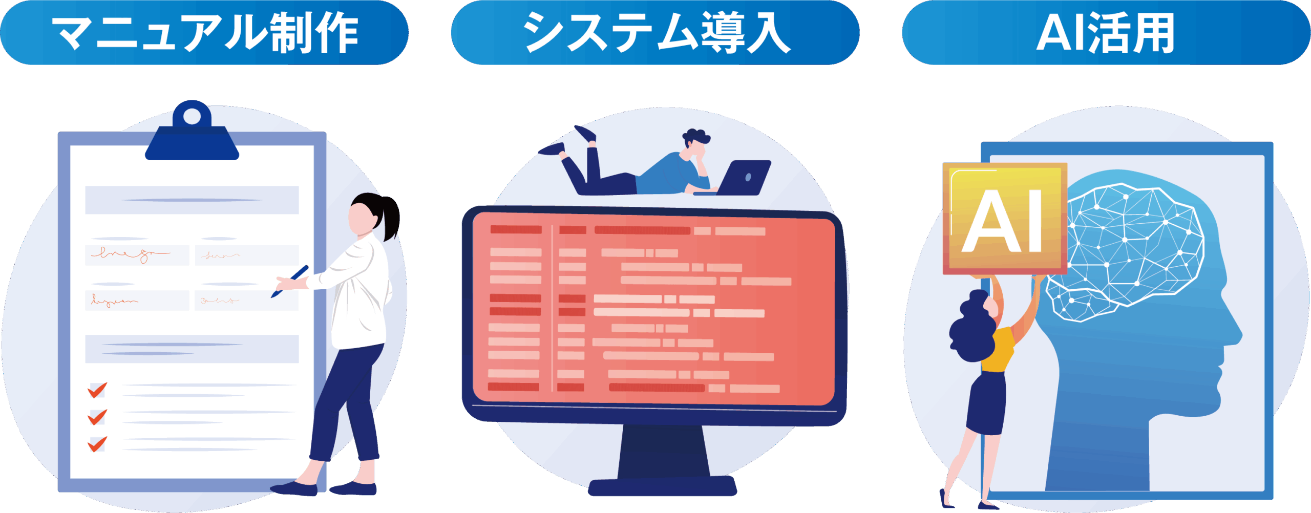 業務を見える化するマニュアル制作、効率化を支えるシステム構築、最先端のAI活用により、現場に即したDXの土台を“創造”します。